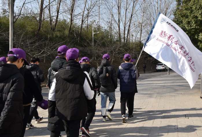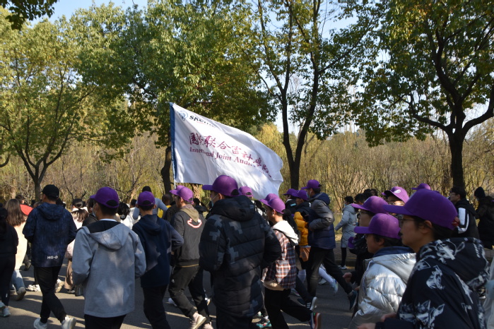 发令开跑后,国际联合审计学院的排头兵高举院旗,一马当先地冲出起点。在冬季暖阳的照耀下,雪白的院旗独树一帜,为大部队指明了方向。