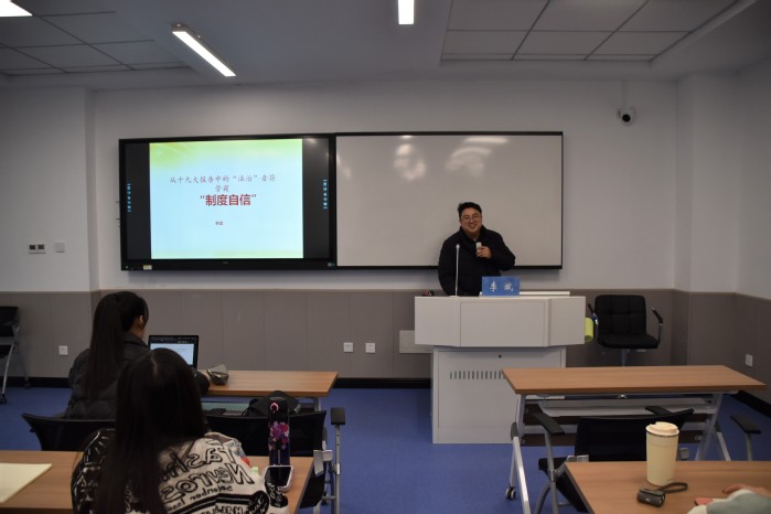 12月9日下午,国际联合审计学院第一期青共校第五讲于IEA1教室举行。本次团课主题为“从十九大报告中的法治音符管窥制度自信”,由校心理健康教育与指导中心副主任李斌老师主讲,UG环球360官方网站青共校全体学员参与听讲。