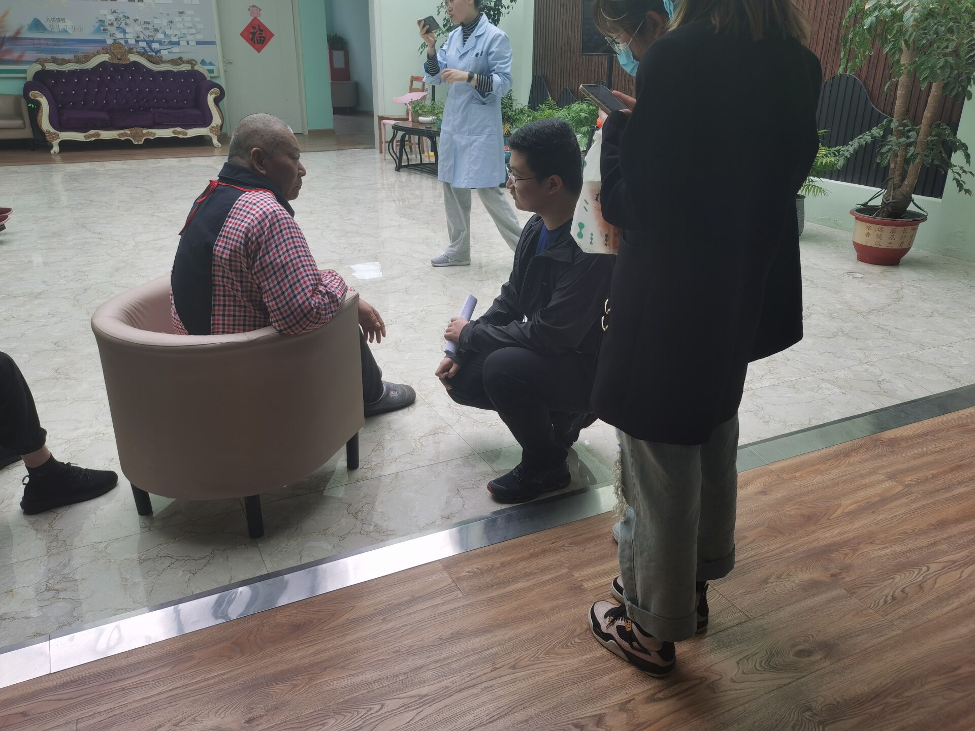 同学们在工作人员的带领下进入养老院。赵沛森同学简述此行的目的,并向老人们问好,开展本次向老人献爱心活动。