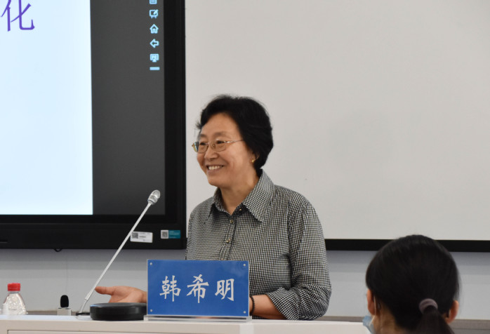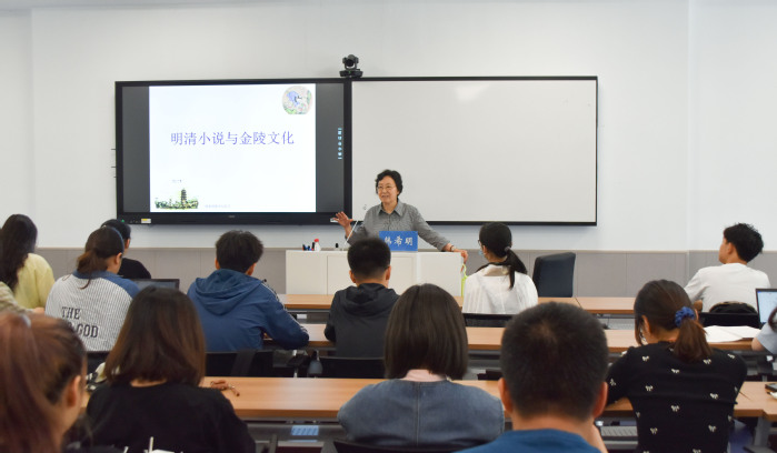 韩希明从如何读懂小说讲起,指出把握好小说诞生的文化背景对于理解小说内涵、与作者产生情感共鸣具有重要意义。随后,韩希明带领同学们深入探究明清小说中的具体细节,通过对比《红楼梦》《金瓶梅》《儒林外史》《聊斋志异》等作品中关于服饰文化和民俗的描写,挖掘金陵传统文化,并向同学们阐述小说中塑造的人物性格特点,进而反映出明清时期的社会背景。韩希明教授旁征博引,将金陵文化与文学艺术相融合,为同学们打开了阅读和研习的魅力之窗。