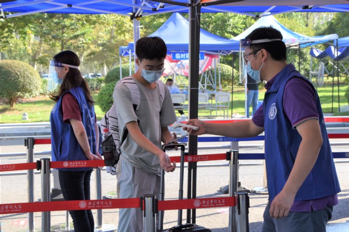 辅导员们参与学校疫情防控工作,在校门口为返校新生测量体温。他们是新生们见到的第一张熟悉的面孔。