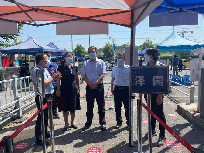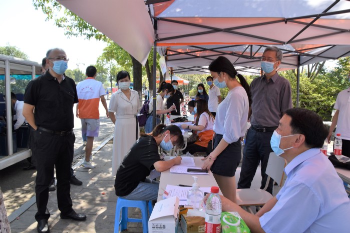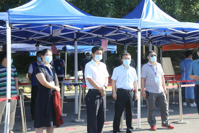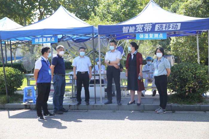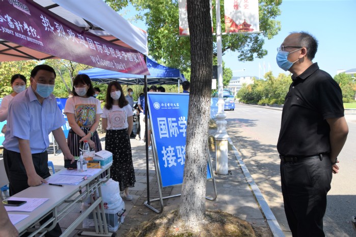 纪委书记龚亲华等相关部门领导来到国际学院接驳点查看返校情况。
