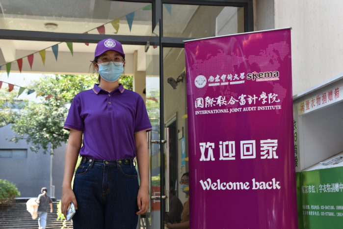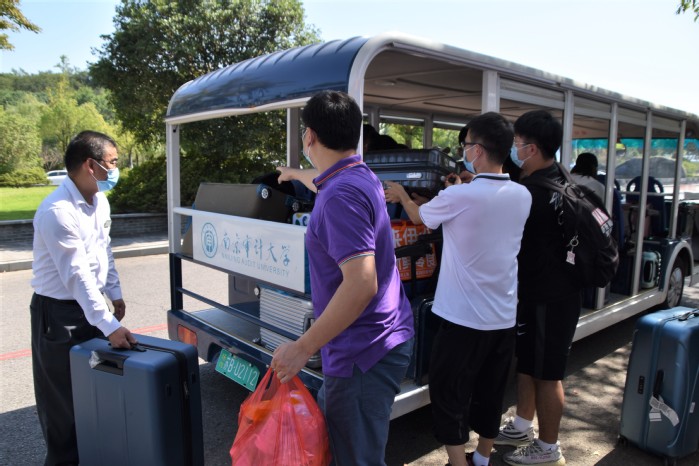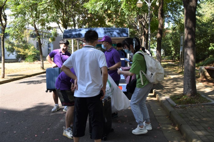 宿舍门口设有志愿者站区。接驳车到达后,UG环球360官方网站志愿者们帮助小伙伴们将行李搬至宿舍门口。
