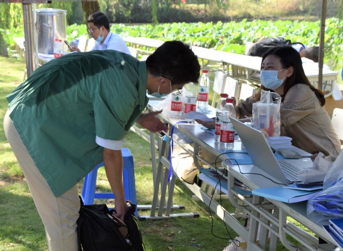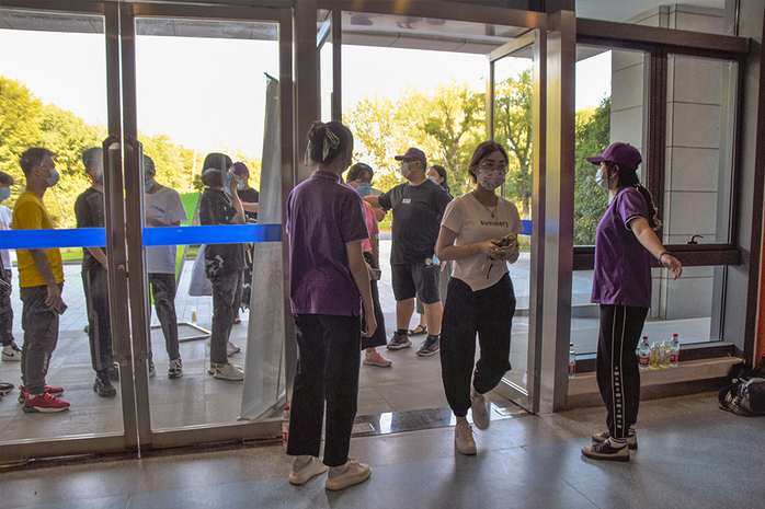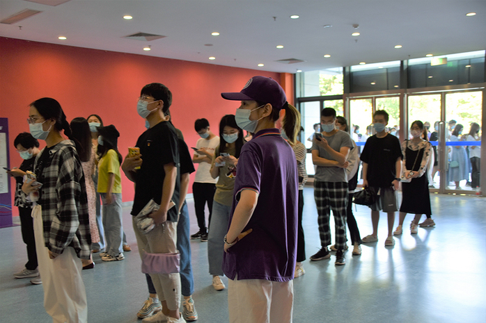 国际学院学生为返校生做核酸检测志愿工作,现场排列有序。