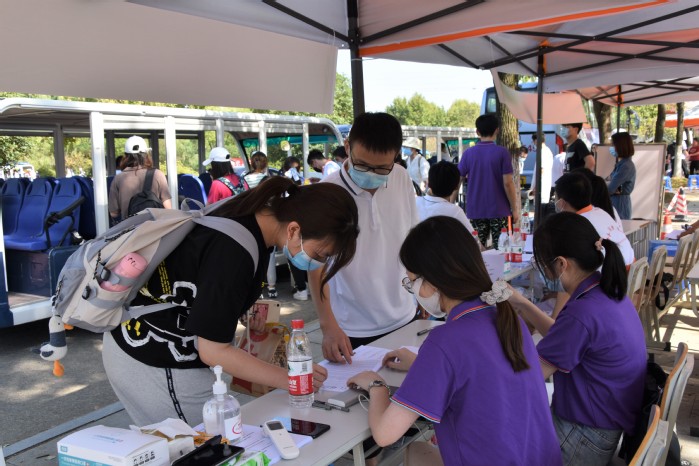 志愿者们在接驳点为返校生们登记。辛勤的辅导员们在接驳点帮助返校学生登记,并将行李搬至接驳车上。