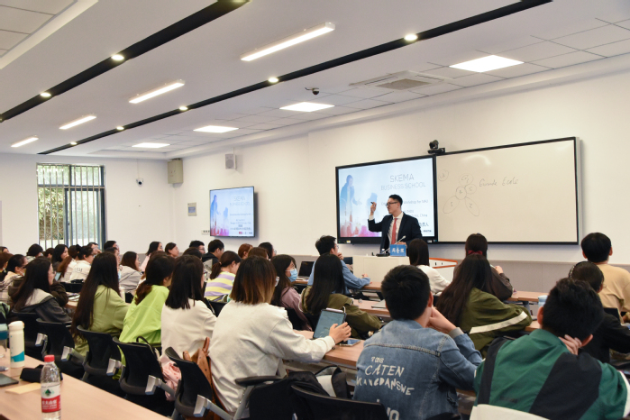 首先,周查理从全球本土化的SKEMA Ventures(SKEMA全球创业中心)讲起,随后以苹果手机、可口可乐、依云矿泉水为例逐步引导学生进入了“创新创业”的语境。在周查理的耐心讲解下,同学们渐渐明白了创业的基本逻辑,也明白了回应消费者的需求可谓是创业美好的开始。