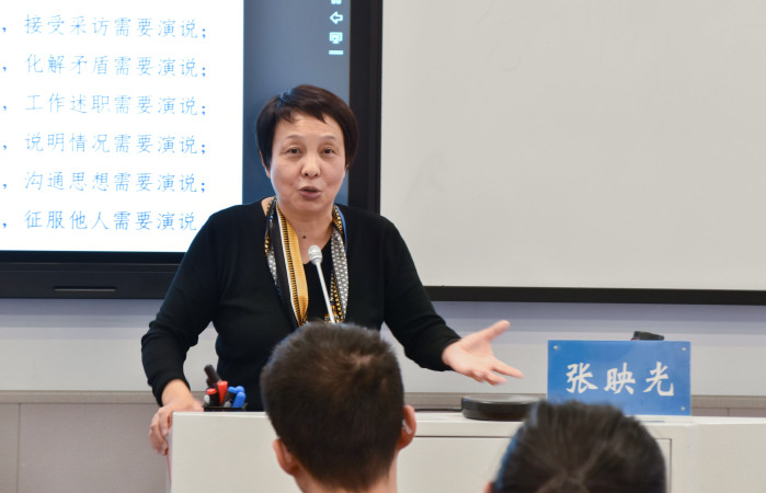张映光首先阐述了口才在当今社会的重要性,点出当代大学生普遍存在“不会表达自我”的问题。她强调,虽然在校园内,口才并不是一门“专业必修课”,但在走出校园后,相较于对书本知识的掌握,好的口才往往能让人更快脱颖而出。