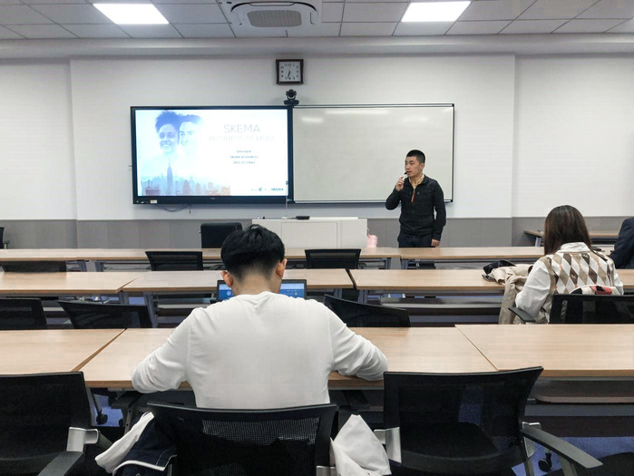 陈佳名详细介绍了SKEMA商学院Career Office及服务工作内容:SKEMA商学院职业生涯规划师根据不同学生的发展意向,划分不同发展方向并提供强大的资源支持。这包括:为SKEMA学员制定科学的职业规划;邀请成功企业家和大家一一交谈,答疑解惑,指明方向;邀请知名企业宣讲,当场录取优秀学员;组织大型企业参观学习活动。