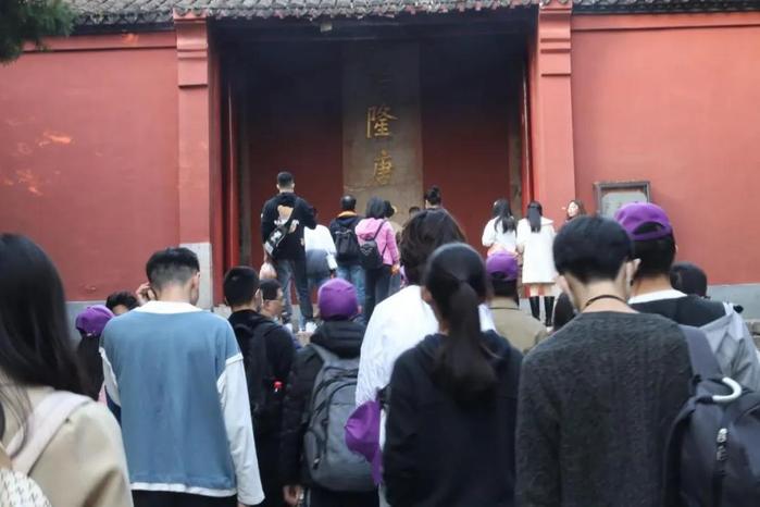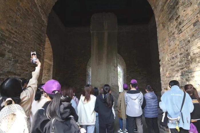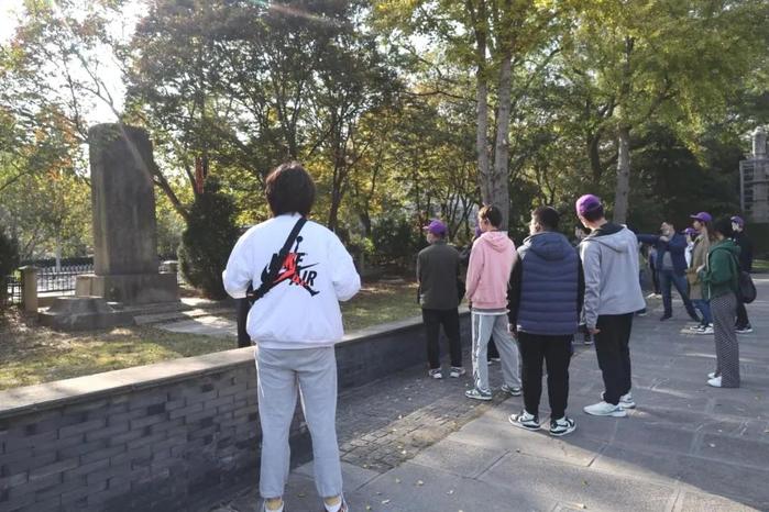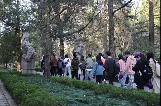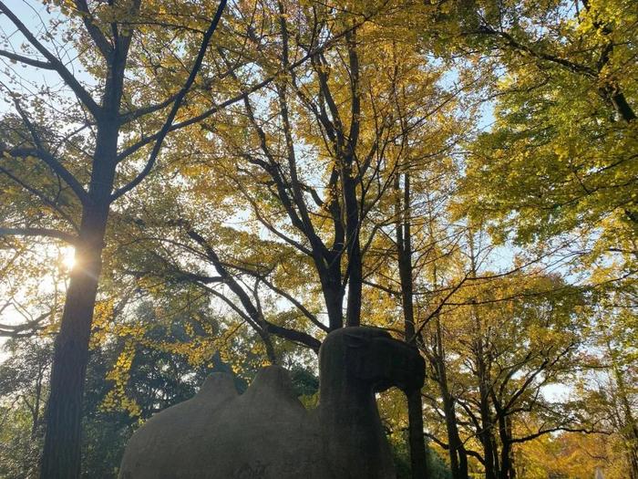 走入明孝陵的核心地带,面前是随山势蜿蜒而建的神道。同学们从东向西走上600米的神道,两侧的狮子、獬豸、骆驼、象、麒麟、马共6种石像依序排列,中间的望柱安静地伫立着,肃穆而威严,每一处斑驳的痕迹都在告诉你,这里埋葬着帝王的尸骨。如今的“石象路”,色彩斑斓,气象庄严,已经成为南京一张靓丽的文化名片,号称“金陵之秋最美六百米”。