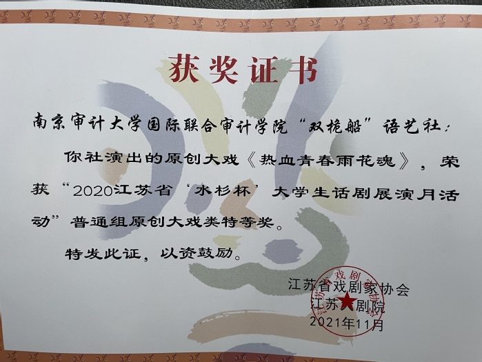 11月20日,由江苏省戏剧家协会、南京市文化馆主办的2020江苏省“水杉杯”大学生话剧展演月活动在南京文化艺术中心艺时间剧场拉开帷幕。国际联合审计学院艺术党课《热血青春雨花魂》荣获普通组原创大戏类特等奖。