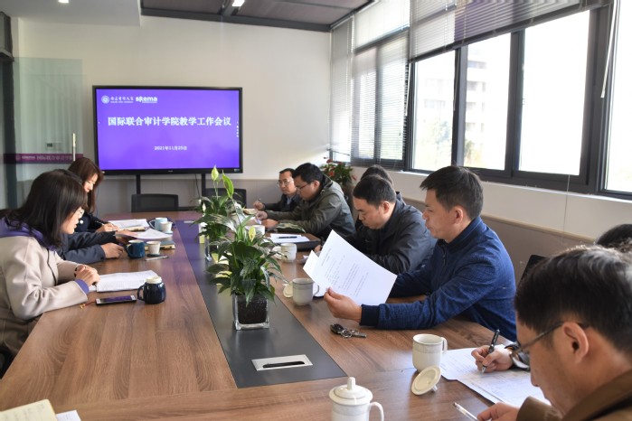 2021年11月25号下午,国际联合审计学院召开教学工作会议,研讨学院课程建设工作并对下学期中方课程任课教师初选结果进行了审议。金融学院党委书记谷政、继续教育学院院长王家华、工程审计学院副书记副院长徐庆阳、会计学院副院长黄中生、经济学院副书记、副院长方阳娥、统计与数据科学学院副书记、副院长李垠、马克思主义学院副院长庞超等相关学院领导受邀出席会议,学院党总支书记姜德波、院长王素梅、副院长张文秀参加了会议。会议由王素梅主持。