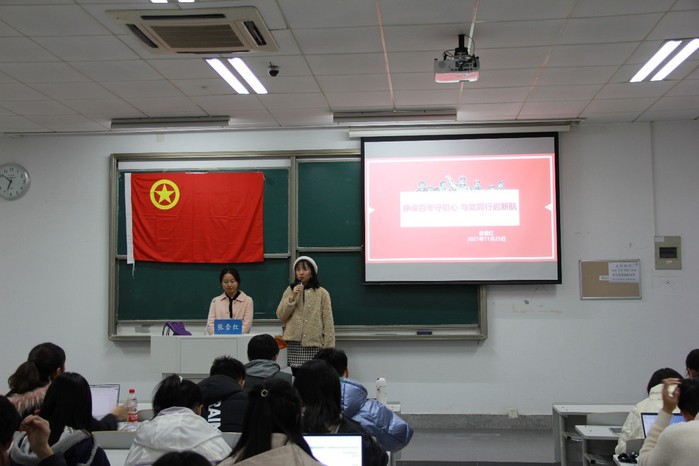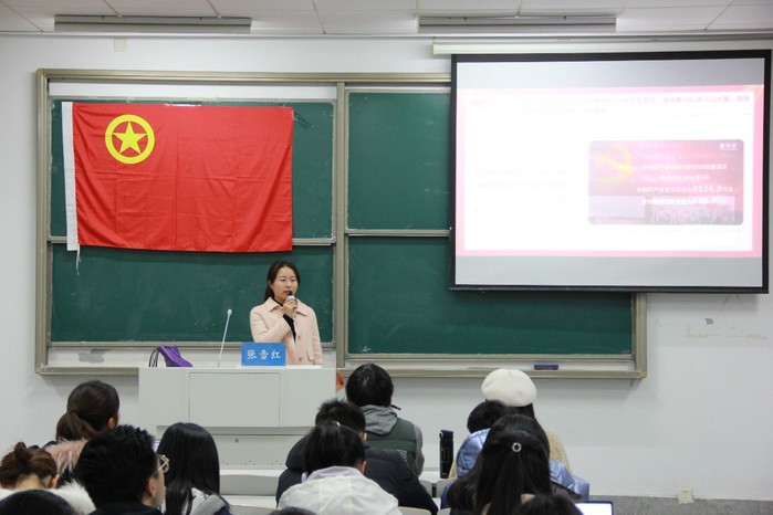 2021年11月25日晚,国际学院特邀学生工作处思想政治教育中心主任张雪红老师,为学院全体青共校学员带来主题为“峥嵘百年守初心,与党同行启新航”的青共校理论课。本次青共校理论课由国际学院分团委书记朱明洁主持。