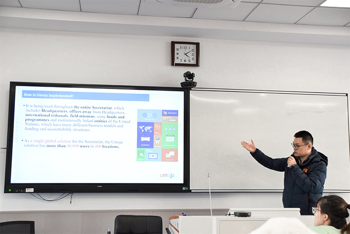 朱翼从联合国的信息系统UMOJA、以人居署为例的电子数据审计以及UMOJA信息系统审计三个角度切入,向同学们介绍了联合国的审计情况。