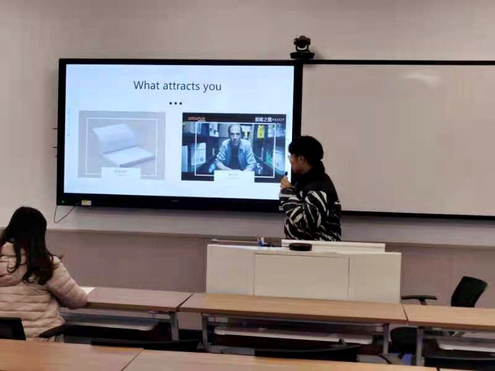 茶艺课堂负责人瞿菲欣喜地向大家汇报同学对茶艺掌握的巨大进步;迷你法语课堂负责人彭振还表达了对老师支持的感激;诗与影课堂负责人靖振宇重点汇报了分组拍摄的微电影考核模式……