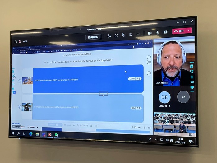 本次讲座的主题为:“从孙子到史蒂芬·乔布斯:前景、战略和创新(vision、strategy and innovation)”。Marcos教授先以一个迷失的森林中的老人和迷失在沙漠中的年轻人的一个小故事开始,引导同学们通过SKEMA线上互动程序进行投票,思考二者的生存环境和能力。接着,他引出了考虑前景陈述的四个部分,即客户、客户需求、自身的产品和服务、自身的价值。Marcos从军事战略和中国古代伟大的军事家孙子的思想入手为同学们引入战略的概念,并且强调要学会进行外部的机会和危险以及内部的优势和劣势的分析。