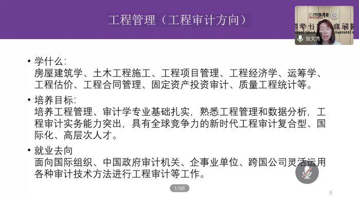 首先,张文秀副院长从人才培养目标、能力体系、课程体系三个方面细致地解读人才培养方案。国际联合审计学院以学生为中心,融合UG环球360官方网站和法国SKEMA商学院两校优势与特色,制订“专业+审计+信息化+跨文化交流”培养方案,旨在培养学生成为拥有家国情怀和国际视野的多元复合型国际审计人才。学院建立“四课堂”体系,引入法方优质教学资源,采用研究导向型教学。张文秀副院长分别针对学院的四个专业提出对应的要求与目标,并指出未来的就业方向。对于同学提出的普遍问题,她也耐心地进行了解答,让同学们对于学院的人才培养方案有了更全面的认识。