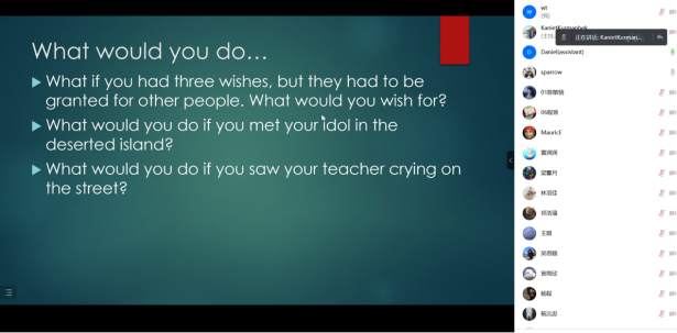 The theme of March 16th’s English corner is What if... , I will.... Though students were a little unfamiliar with the online mode, with the guidance of teacher Kaniet, students actively expressed their own ideas. Some hoped that COVID-19 should end soon so they can go back to the days they could travel around without wearing masks. Some mentioned that they hoped the world would have less prejudice, but more care for vulnerable groups and resistance to racial discrimination... Kaniet praised the students' opinions frequently, and extended his own ideas. He hoped that the world could return to peace as soon as possible and we could build a harmonious global village together.