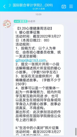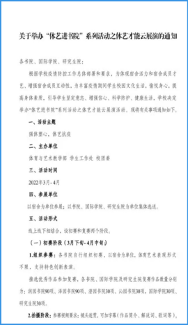 学院积极组织班会、讲座、“英语角”活动、“法语角”活动、团支部风采大赛、宿舍才艺云展演、“审·春”摄影比赛等活动,同时鼓励同学们坚持晨跑打卡,开放自习室,让同学们走出宿舍,参加符合疫情防控的文体活动,在相对安全的户外阳光生活。