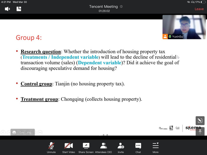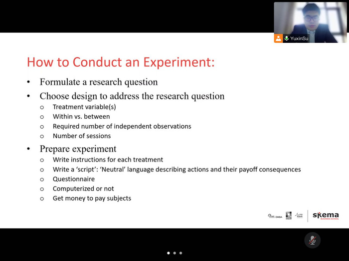 3月30日下午, 青年国际人才班研究方法系列讲座“实验设计”第二讲在腾讯会议举行,国际联合审计学院经济学助理教授苏昱昕带领同学们继续探索实验设计方法。在第一次讲座中,苏老师初步介绍了一些科学研究的基本概念和实验方法,本次讲座主要通过案例学习进一步提高同学们对经济学实验研究方法的理解。