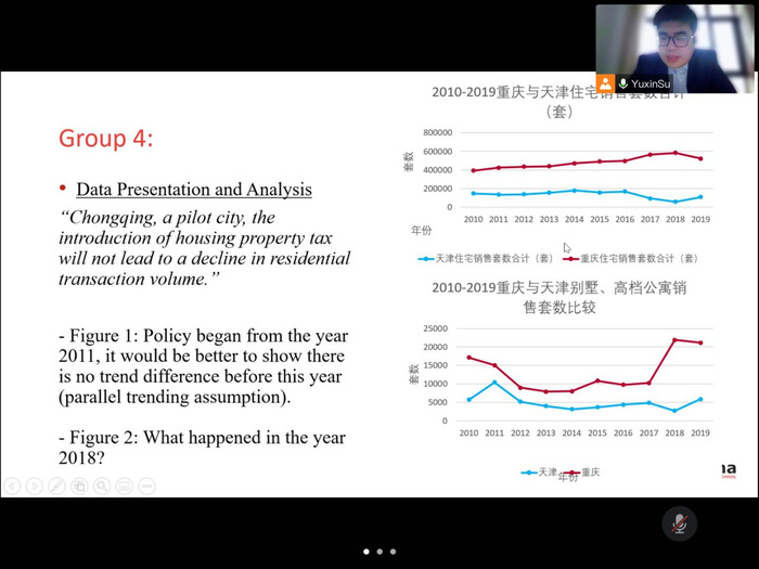 最后的小组任务部分,苏老师通过外卖送达地点与人们点外卖的积极性、心理干预与焦虑缓解效果、房产税与房屋交易量的关系等六组试验,引导同学们对一些经济现象进行分析。