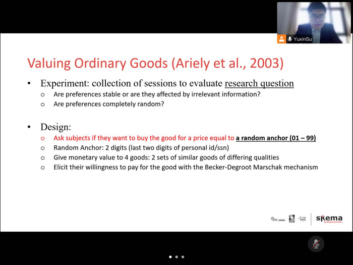 讲座开始,苏老师以亚马孙河长度的问题引入了Ariely等人在2003年开展的一个评估普通商品价值的实验,这个实验在于探究人们的偏好的稳定性与随机性。研究人员得出结论:估价对任意锚定价值(arbitrary anchor values)高度敏感,在初始评估后,选择具有一致性并且对后续选择具有持续影响。