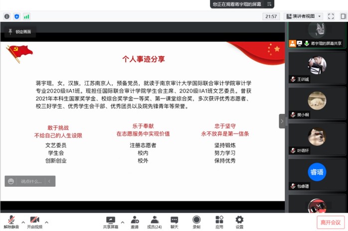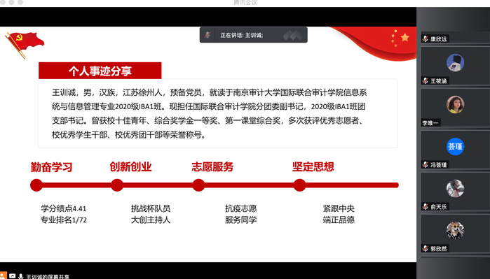 为迎接2022年“五四”青年节的到来,充分展现和发挥优秀青年的示范引领作用,4月26日至5月2日,国际联合审计学院“优秀青年事迹分享会”以线上线下结合的方式开展。10位优秀青年分别面向班团支部同学、寝室室友、学生干部等不同群体分享了自己在学习、学生工作、创新创业、志愿服务等方面的经验感悟,并与同学们交流体会,增进学生友谊,营造良好风气。