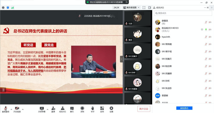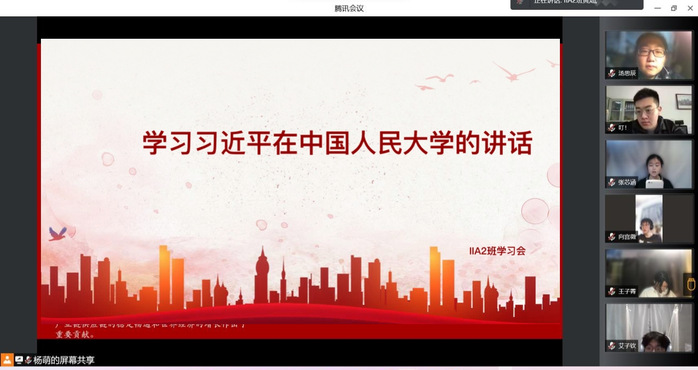 为深入学习贯彻习近平总书记重要讲话精神,进一步提高思想觉悟,4月28日至5月3日,国际联合审计学院各班级通过线上方式有序开展了“习近平总书记在中国人民大学考察时的重要讲话”学习会。