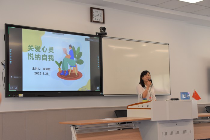 最后,李慧敏老师为同学们开展了主题为“关爱心灵,悦纳自我”的心理讲座。讲座分为“认识自我,悦纳自我,调控自我”三个部分。