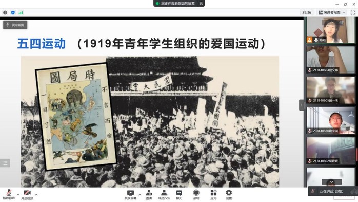 讲座伊始,郑如为同学们播放影片《我的1919》片段,讲述一战结束后巴黎和会召开,中国作为战胜国之一,派出五人代表团出席,却遭到欧美、日本等国剥削的惨痛历史。观看完影片,郑如以习近平总书记在纪念“五四运动”100周年大会上的讲话引出“五四精神”的内涵:爱国、进步、民主、科学。郑如就“为什么说‘五四精神’核心是爱国主义”,带领同学们一同回望建团一百年以来的浩荡历史,进一步了解“五四运动”的背景。