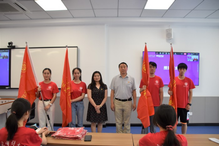 王静为学院2022年暑期社会实践服务团授旗。