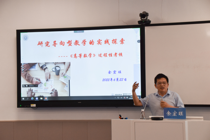 余宏旺副教授分享了《高等数学》课程研究导向型教学中过程性考核是如何实施的。他从研究导向型教学的目标谈起,详细阐述了过程性考核的溯源与特征、过程性考核的指标和要求以及对研究导向型教学的反思。