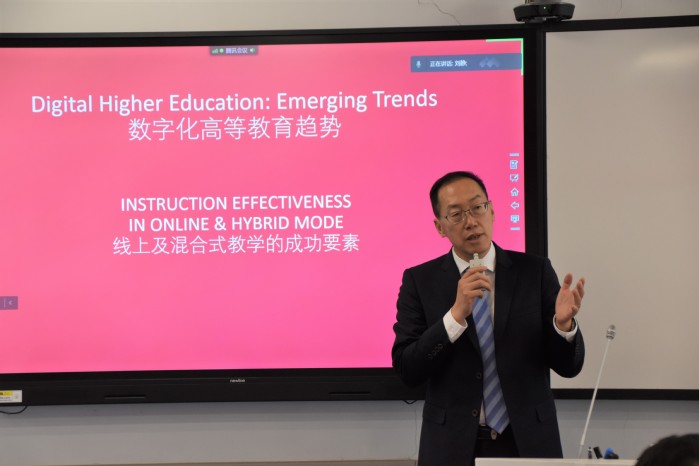 国际联合审计学院法方副院长窦文宇教授以高等教育数字化趋势与挑战为题,介绍了高等教育数字化的背景和发展趋势,并结合自己的在线教学经验,指出教育学研究启迪下的线上教学成功的核心要素并对提升混合式教学成效提出了建议。