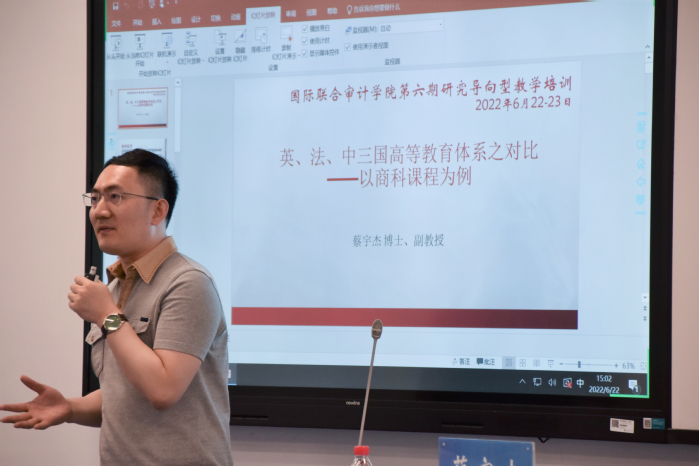 国际联合审计学院和法国SKEMA商学院人力资源管理学副教授蔡宇杰结合自己在国外大学多年的执教经验,向大家介绍了英、法、中三国学制和培养方式、教育侧重点、分数成绩评定和辅导员与英法大学导师等方面的异同,并以商科课程为例,分享了英国大学课程教学要求、教学流程及课程考核等方面的做法和自己的心得体会。