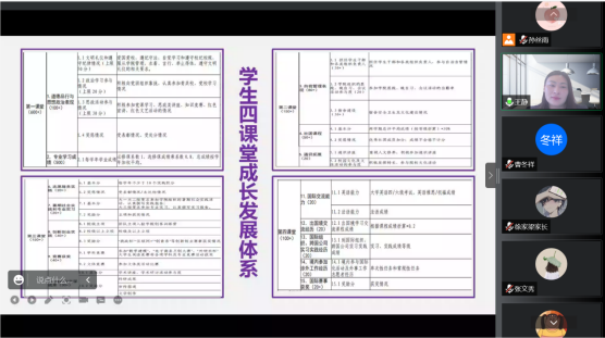 王静以“学生成长”为主题,对本科学生导师制、四课堂成长发展体系和奖学金激励机制进行了详细解读,强调了成长积分制的导向作用。她对在思想政治、学业成绩、第二课堂、学科竞赛、社会调研、创新创业等方面表现突出的同学进行了表扬,同时对违规违纪行为进行了通报,对学习困难和心理困难学生发出了预警。最后,她向家长提出了倡议,要在平时与学生加强沟通交流,家校合力关注学生身心健康、关心学生成人成才。