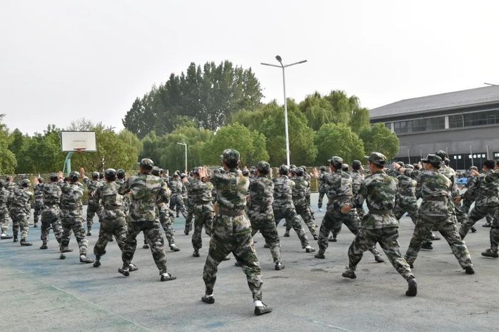 军体拳,动作精炼,节奏分明,同学们毫不懈怠,一勾一拳中尽是“新生”力量。