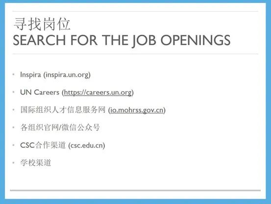 讲座围绕四个方面进行:为什么要在UN工作、我能在UN做什么、UN实习项目是什么、如何申请。