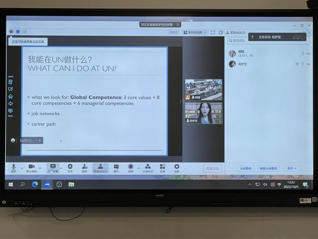 10月5日中午,国际学院邀请UG环球360官方网站杰出校友倪梦莹为青年国际人才班和2022级国际审计方向审计专硕研究生做题为“如何申请一份国际组织实习”的在线讲座。