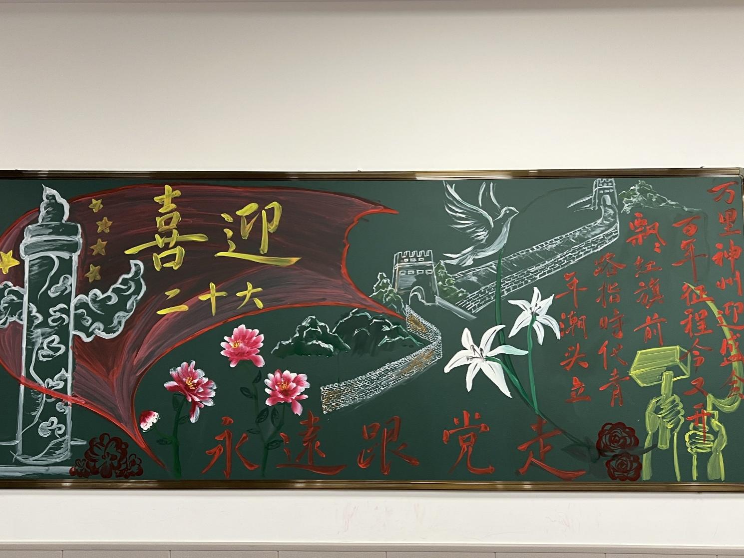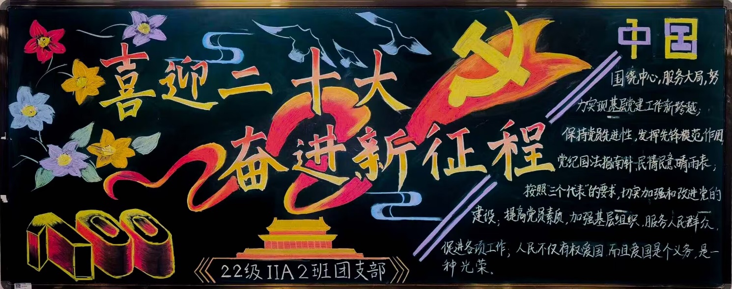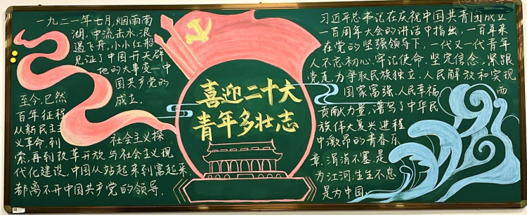即将召开的党的二十大,是在进入全面建设社会主义现代化国家新征程的关键时刻召开的一次十分重要的大会,将科学谋划未来5年乃至更长时期党和国家事业发展的目标任务和大政方针。板报上的华表与红旗指引着我们,以牡丹般的激情与火热前行,绘就新篇章的盛世;更指引着我们,用镰刀与锤子般入世的坚韧与奋斗,终迎来飞翔在长城乃至世界上空的和平之鸽。