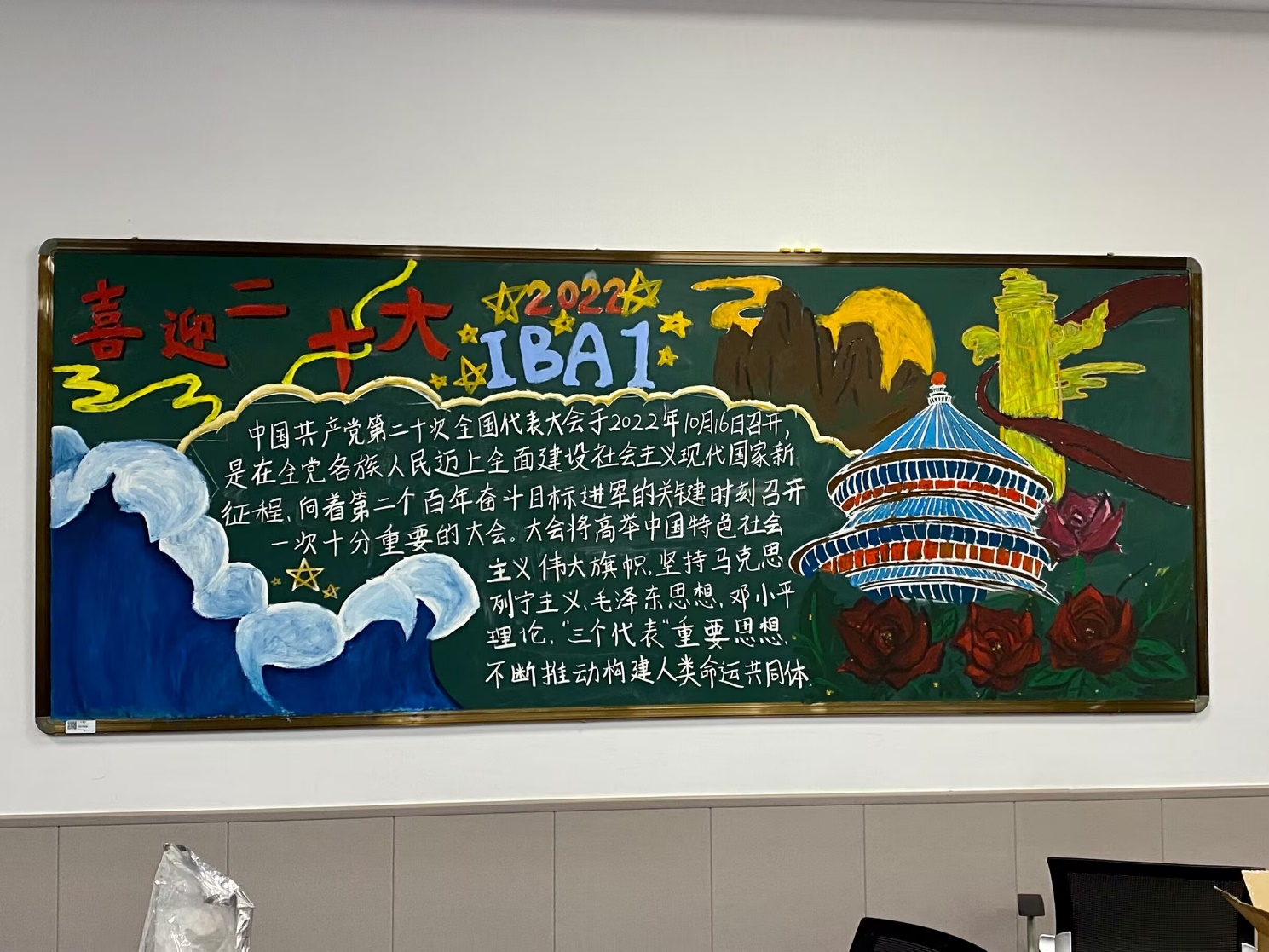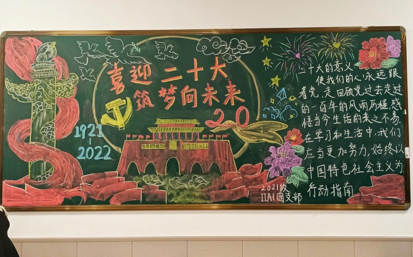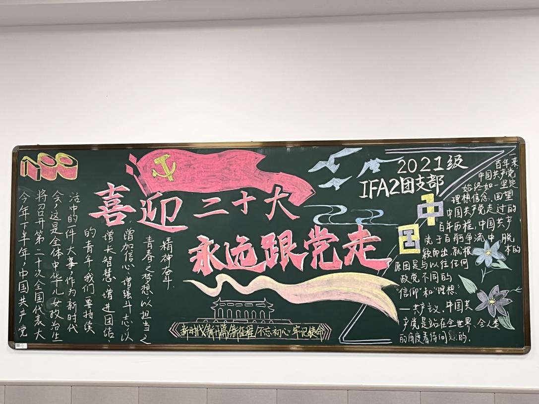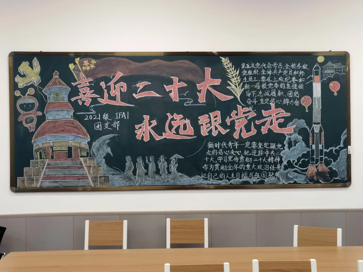 IFA1班团支部的主题板报紧紧围绕迎接党的二十大胜利召开和学习贯彻我校第五次党代会精神绘制。黑板底部的海浪代表着我们面对挑战和未知永不停歇、坚持不懈、奋发向前的精神;海浪之上的五位人物剪影分别代表着工农阶级、科研人员、教师、青年学子、党员干部,他们是时代的弄潮儿;板报右侧代表着中国这五年的稳健腾飞,冉冉火箭不仅代表中国航天事业的发展,也代表了中国在各行各业的卓越成就;板报左侧是中国著名古建筑天坛,它不仅是历史文化的象征,也代表中国民族的古典文化不会被时代浪潮抹去;左上角还有一个可爱的玩偶,它是共青团中央新媒体的IP形象团团,代表着青年对党和祖国的热爱;板报正中央是本次的主题,五星红旗迎风飘扬, IFA1班团支部全体同学喜迎盛会!