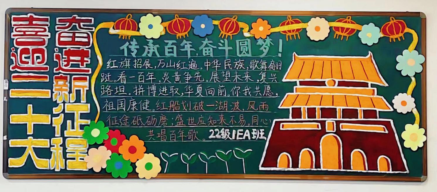 22级IIA3班的黑板报整体色彩明快,构图细致,元素象征性强,风格简洁大方。进入教室,党旗与飘带映入眼帘,加以红黄经典配色,象征天地洪荒之宏阔;党旗荫蔽着飞檐城楼,晓以山河无恙、四海欢腾;浪花澎湃出祥云之相,推后浪逐前浪,跃动盛世赞歌。