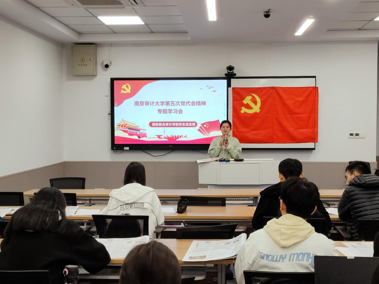 在一系列专题学习会上,国际学院党总支书记姜德波传达了学校第五次党员代表大会的精神,带领全体师生认真学习了校党委书记晏维龙所作报告《立足新起点 开启新征程 奋力推进一流特色大学建设再上新台阶》以及纪委报告《推动新时代学校纪检监察工作高质量发展 为建设一流特色大学提供坚强纪律保障》,重点解读了报告中凝练的七条宝贵经验,深刻分析了学校发展面临的新形势新挑战,建成“审计特色鲜明的世界一流大学”的远景目标及未来“三步走”发展战略。