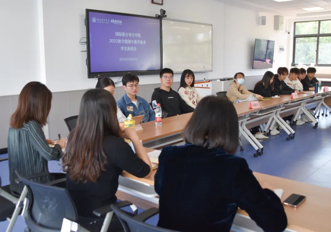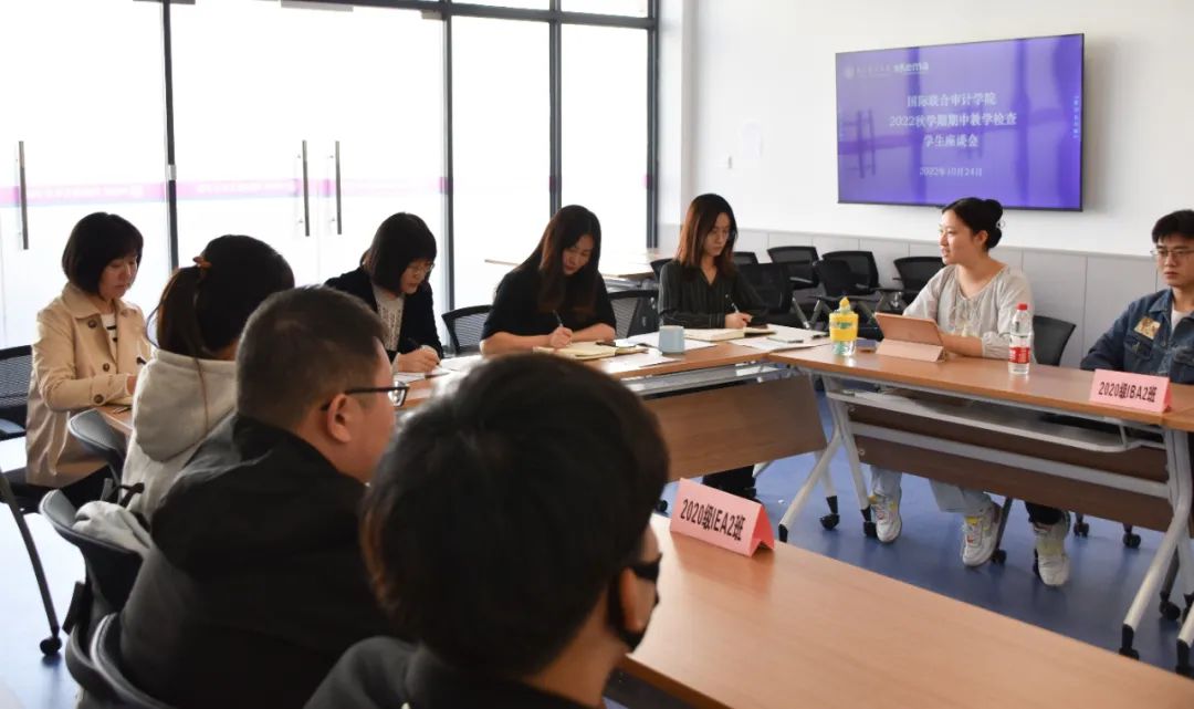 10月24日,国际联合审计学院召开2022秋学期期中教学检查学生座谈会,院长王素梅、法方副院长窦文宇、副书记、副院长王静、相关教务老师及来自2020级各专业班级的学生代表参与座谈。