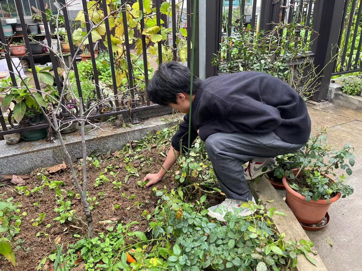 甘梓恒同学帮助刘教授清理院中杂草