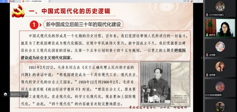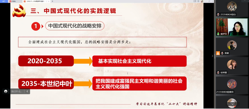 课程的第三部分,顾梦佳重点聚焦中国式现代化的实践逻辑,由理论过渡到具象化的实践,从战略安排、重大原则、具体举措三方面剖析了中国式现代化对于当今中国走特色主义发展道路的重要意义。顾梦佳指出,只有坚持和加强党的全面领导、坚持走中国特色社会主义发展道路、坚持深化改革开放、坚持发扬斗争精神,才能谱写全面建设社会主义现代化强国的壮阔蓝图。她引用监管部门对阿里、美团等公司展开反垄断调查的案例说明了坚持党的领导、强化反垄断和防止资本无序扩张对于行业健康、经济可持续发展的重要意义。