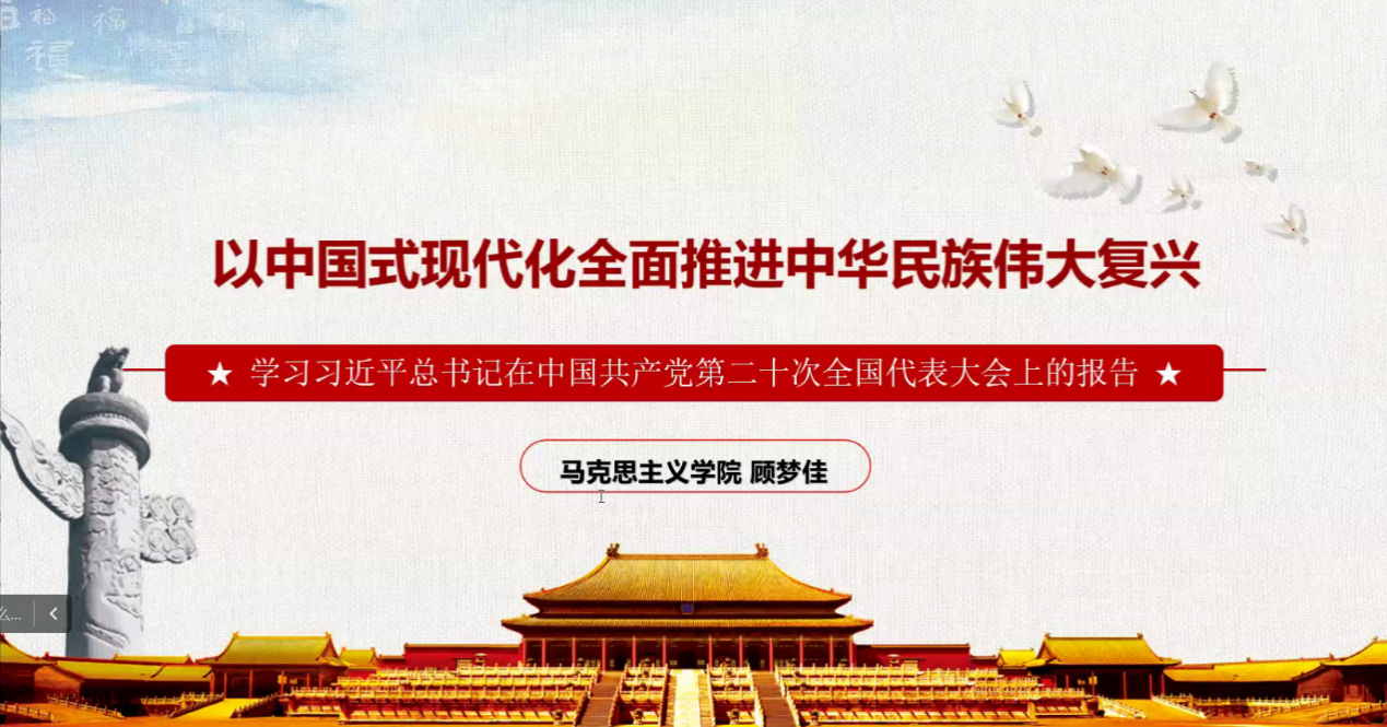 为深入学习贯彻党的二十大精神,11月25日,学院特邀马克思主义学院顾梦佳老师上信仰公开课,主题为“以中国式现代化全面推进中华民族伟大复兴”。本次公开课由学院分团委书记朱明洁主持,全体学生党员、发展对象以及第五期青共校学员以线上形式参加。