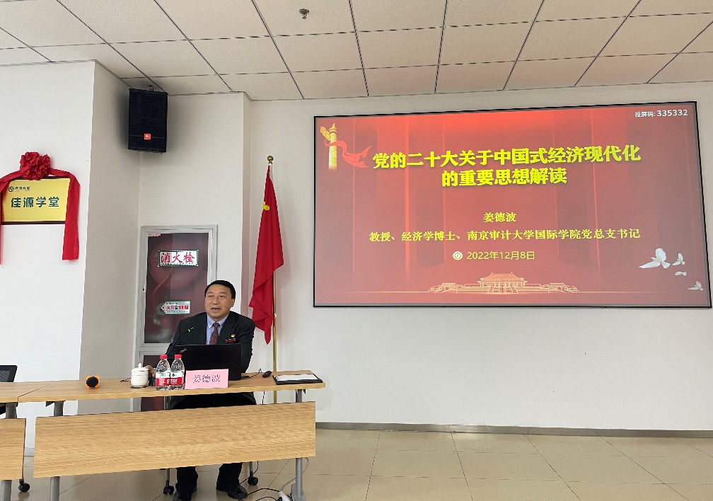 签约仪式后,双方开展第一次支部联学共建活动,国际学院党总支书记姜德波为佳源科技股份有限公司党员职工上《党的二十大关于中国式经济现代化的重要思想解读》专题党课,从中国式现代化是一个系统工程、中国式经济现代化的现实基础、中国式经济现代化的战略步骤、中国式经济现代化的价值取向和中国式经济现代化的推进举措五个方面诠释了中国式现代化的核心和内涵,并结合民营企业的实际展开具体阐述。