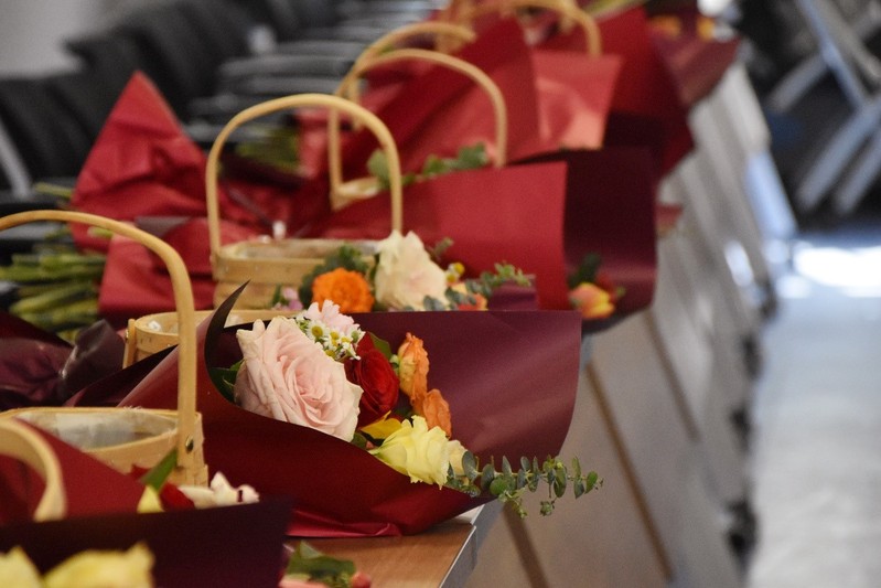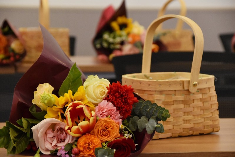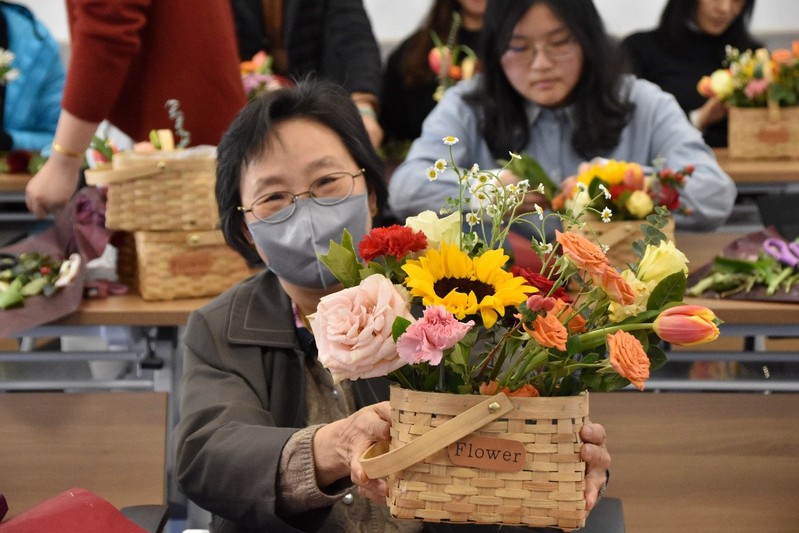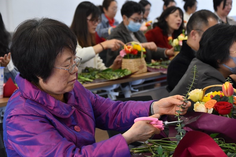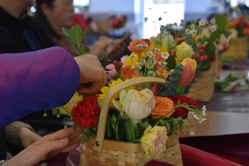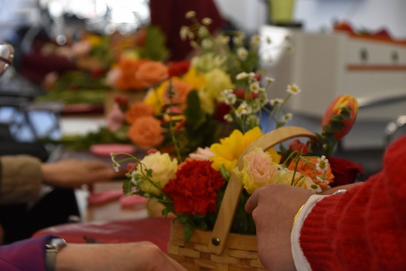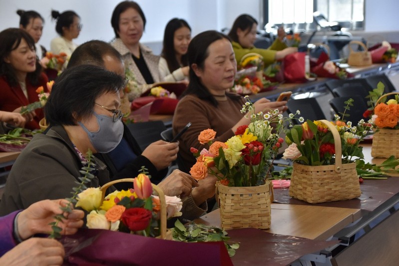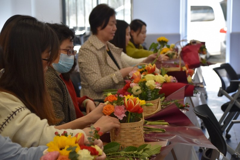 活动现场为大家准备了精美的鲜花、花泥、剪刀等插花工具,并邀请了经验丰富的花艺老师现场指导,她从花的种类、寓意、搭配等方面进行详细讲解。大家在老师的指导下发挥想象、修剪花枝,制作出了一盆盆象征着祝福与美好的插花作品。