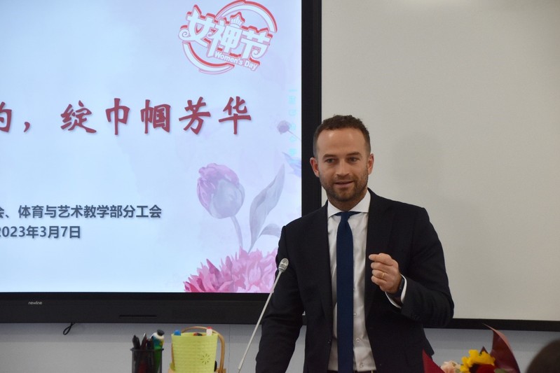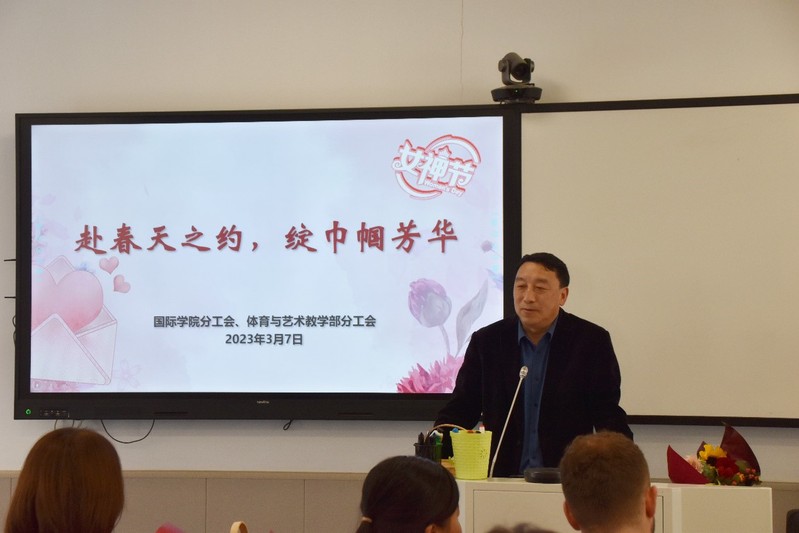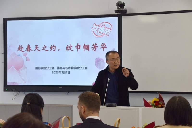 为庆祝国际劳动妇女节,3月7日下午国际学院分工会、体育与艺术教学部分工会联合举办“赴春天之约,绽巾帼芳华”女神节活动,祝愿所有女教职工节日快乐。活动特邀校工会主席潘明霞、韩希明老师、唐燕萍老师共同参与,国际学院党总支书记姜德波、SKEMA苏州校长Matthieu Dumont(杜睿天)、体育与艺术教学部党总支书记况广收出席此次活动。