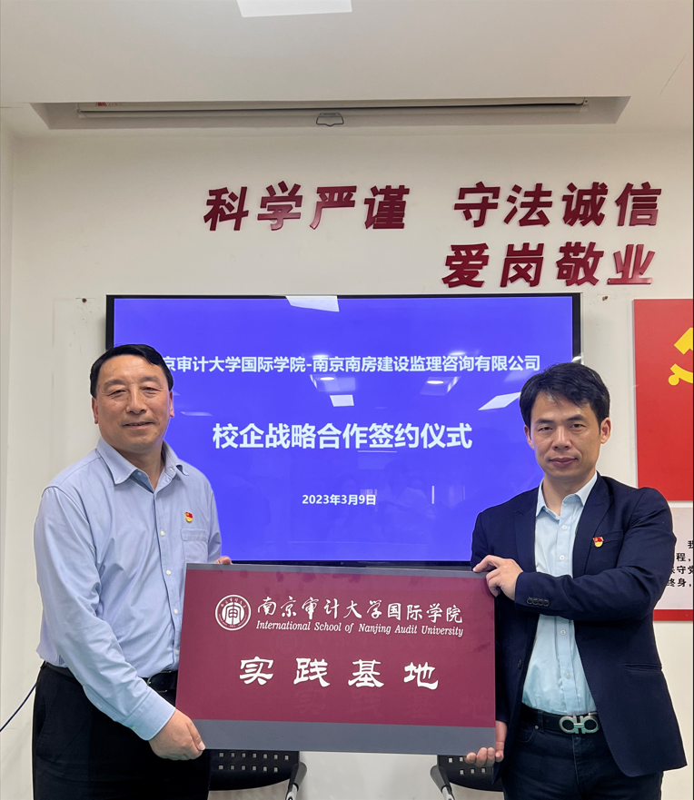 双方就工程审计人才培养方案、实习实践方案、产教研融合等方面进行了深入交流。南房建设监理咨询有限公司总经理张弘景与学院院长王素梅签署战略合作框架协议,学院党总支书记姜德波为南京南房建设监理咨询有限公司“实习基地”授牌。