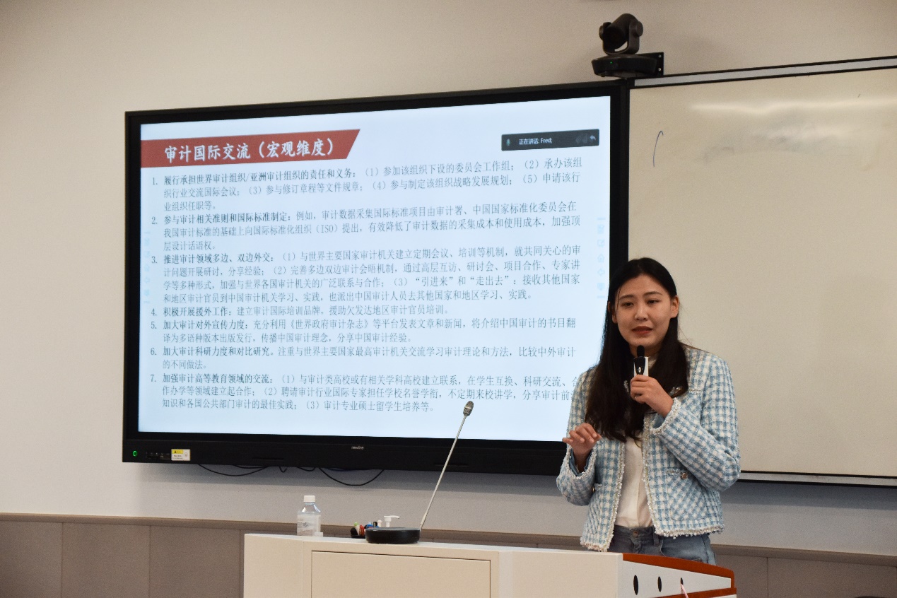 接着,她分别从审计国际交流的宏观维度和微观维度,向同学们介绍了国际审计交流的主要内容。从宏观视角,审计国际交流包括履行承担世界审计组织、亚洲审计组织的责任和义务,参与审计相关准则和国际标准制定,推进审计领域多边、双边外交,积极开展援外工作,加强审计高等教育领域的交流等;而具体落实到微观层面,国际审计主要关注组织的基本情况、财务状况、人力资源状况、项目管理状况、资产和采购情况、信息系统等六大方面。在开展国际审计的过程中,审计师们除了要关注审计相关的问题,也需要回应治理层的关注,以保证审计的有效性和全面性;审计报告的出具更是繁琐复杂的过程,最终报告常常会被分成很多个章节和板块,形成上百页的结论。